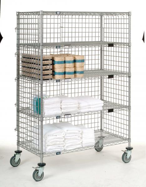 Carts feature open construction for maximum visibility and air penetration. Fast, easy assembly. Shelves with plastic clips easily lock into place on numbered posts and are adjustable on 1” increments.