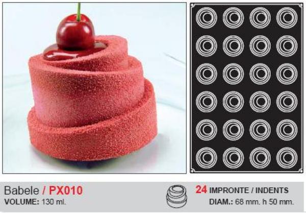 PAVOFLEX PX010 - BABELE 24 shapes, Diam. 68 mm. - Height 50 mm.PAVOFLEX is a new range of 600x400 mm. silicon moulds for an exclusive professional use, designed to be constantly renewed, thanks to more and more innovative and original shapes, in order to improve the creativity and to realize sweet and salted products with a strong impact.