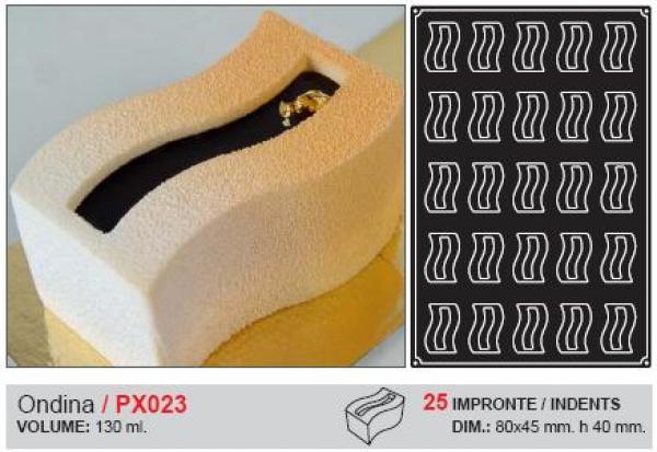 PAVOFLEX PX023 - ONDINA 25 shapes, 80 x 45 mm. - Height 40 mmPAVOFLEX is a new range of 600x400 mm. silicon moulds for an exclusive professional use, designed to be constantly renewed, thanks to more and more innovative and original shapes, in order to improve the creativity and to realize sweet and salted products with a strong impact.
