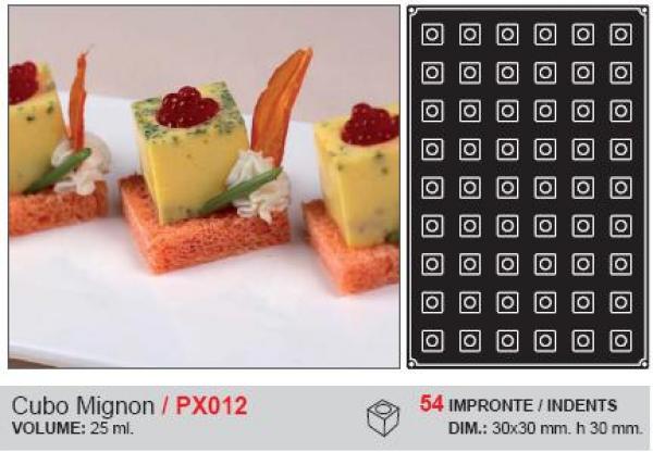 PAVOFLEX Art. PX012 - CUBO MIGNON 54 shapes, Dimension 30x30 mm. - Height 30 mmPAVOFLEX is a new range of 600x400 mm. silicon moulds for an exclusive professional use, designed to be constantly renewed, thanks to more and more innovative and original shapes, in order to improve the creativity and to realize sweet and salted products with a strong impact.