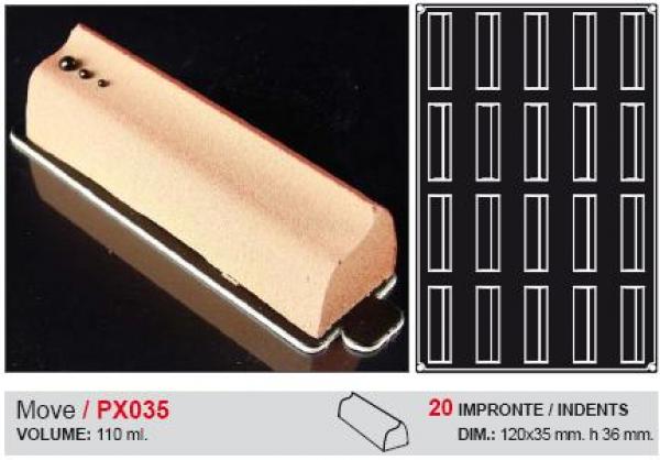 Pavoflex PX035 - MOVE 20 shapes, Dimensions 120 x 35 mm. - Height 36 mmPAVOFLEX is a new range of 600x400 mm. silicon moulds for an exclusive professional use, designed to be constantly renewed, thanks to more and more innovative and original shapes, in order to improve the creativity and to realize sweet and salted products with a strong impact.