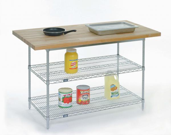 WORK CENTER & ACCESSORIESCombine the storage capacity of a 24" x 48" reinforced adjustable wire shelf with a spacious 30" x 60" or 30" x 72" work surface and you have this multi-purpose WORK CENTER. Solid work surface makes food preparation, repairs, assembly and product handling easy.